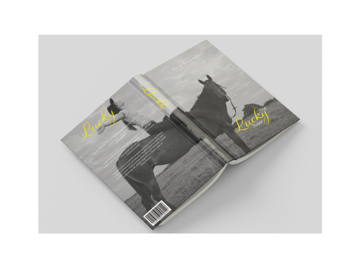 The Lucky Rider is a fictional book cover design that centers on the journey of a determined teenage girl who competes in horse racing and achieves victory at a regional level alongside her horse, Lucky. The visual concept emphasizes both storytelling and aesthetic cohesion, featuring a black-and-white image that evokes a sense of drama and focus. In contrast, the title element “Lucky” is in a bright yellow hue, creating a focal point that immediately captures the viewer’s attention. The design extends across the front and back covers. By choosing to display only the horse on the front cover, the composition builds intrigue and invites readers to engage more deeply with the story behind the image.
