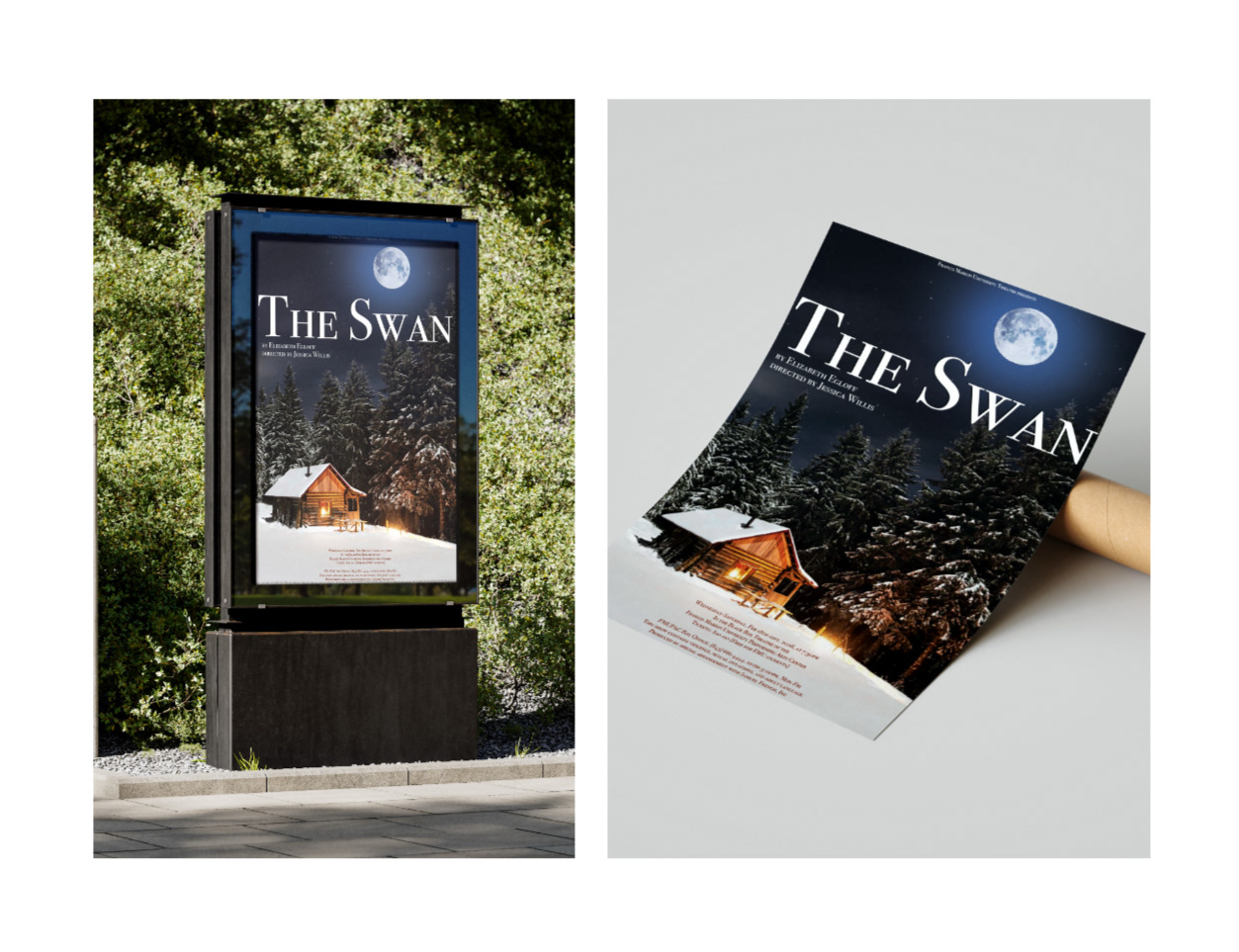 The Swan play poster was made using Adobe Photoshop. I added a moon to match the mood and theme of the play. The image I chose also fits the setting of the story, helping the design feel more connected and easy to understand. The overall design is simple but still eye-catching. It helps draw people in and makes them curious about the play. The poster is also shown on mockups, including a sign outside and a printed poster display, to show how it would look in different places.