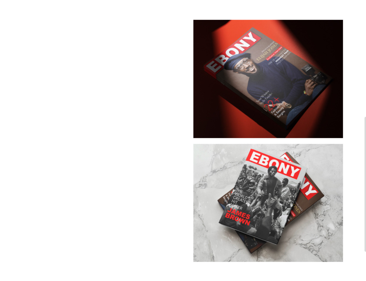 These magazine covers, created for Ebony magazine, showcase a thoughtful blend of cultural homage and contemporary visual storytelling. One design draws inspiration from James Brown, capturing his dynamic legacy through bold composition and expressive styling that reflects his lasting influence on music and culture. The second cover a photographer with an image sourced from Unsplash. Through careful layout, typography, and imagery, both designs align with Ebony’s tradition of celebrating Black excellence while presenting a modernized and engaging aesthetic.